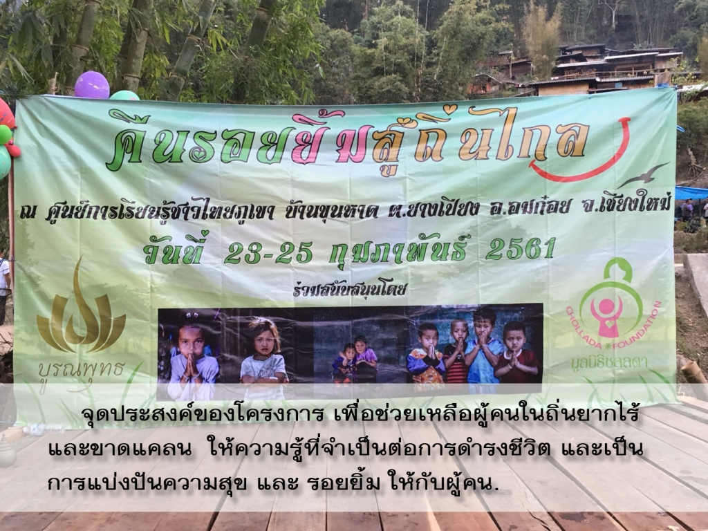 เมื่อวันที่ 23 – 25 กุมภาพันธ์ ที่ผ่านมา มูลนิธิบูรณพุทธ ร่วมกับมูลนิธิชลลดาได้ร่วมสนับสนุนโครงการ “คืนรอยยิ้มสู่ถิ่นไกล” ณ ศูนย์การเรียนรู้ชาวไทยภูเขาบ้านขุนหาด ต.ยางเปียง อ.อมก๋อย จ.เชียงใหม่ โดยมีการทำพิธีมอบโรงเรียนหลังใหม่ให้กับน้อง ๆ นำของใช้ต่าง ๆ ไปบริจาคให้กับเด็กและชาวบ้านในพื้นที่ และได้มีการนำทีมแพทย์ไปตรวจสุขภาพ ให้กับชาวบ้าน อีกทั้งยังมีทีมเกษตรกรที่มาให้ความรู้ในการปลูกต้นกาแฟ การทำสบู่ แชมพู น้ำยาล้างจาน ไว้ใช้เอง และกิจกรรมเลี้ยงอาหาร